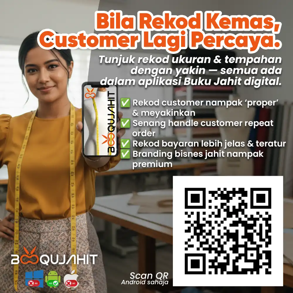 Dapatkan Aplikasi Buku Jahit Digital BOOQUJAHIT versi yang terkini: Cara Tukang Jahit Malaysia Simpan Ukuran & Tempahan Tanpa Serabut (Versi Digital).