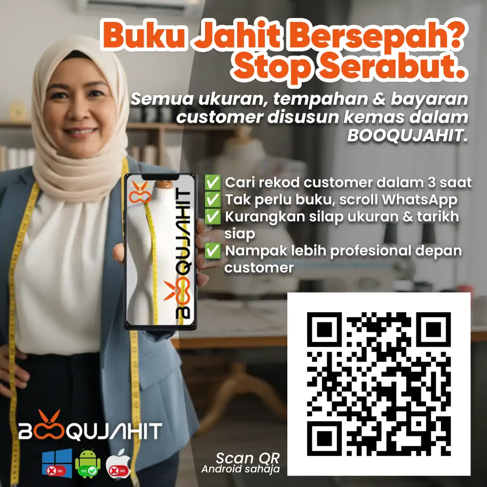 Kalau anda tengah cari aplikasi buku jahit yang memang ikut realiti kerja tukang jahit, BOOQUJAHIT dibuat untuk tujuan tu.